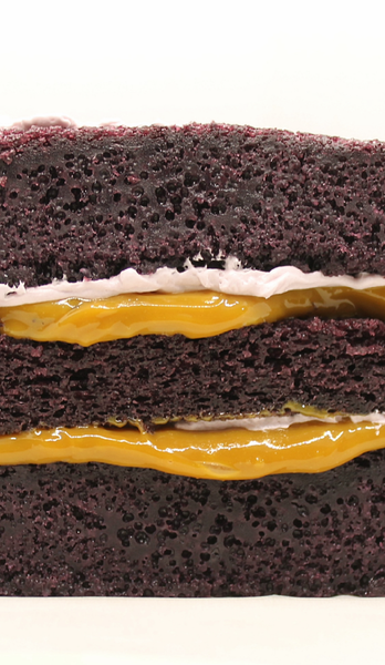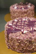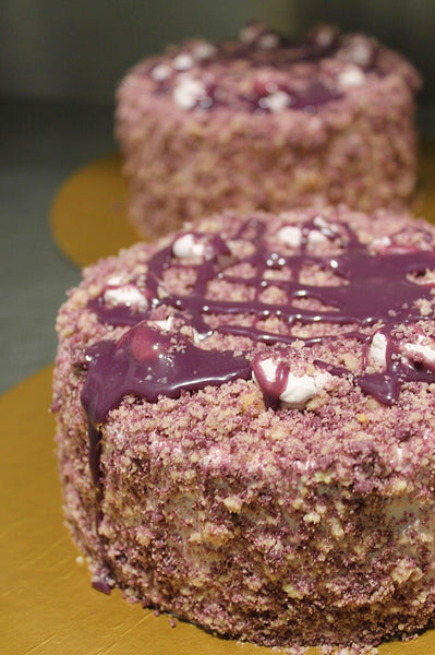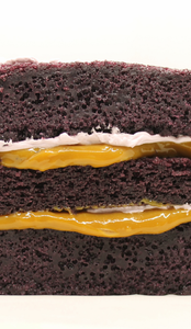 3 layers of ube cake and filled with ube cream. Coated with shortbread cookie crumbs. 6" round cake, and serves 8-10.